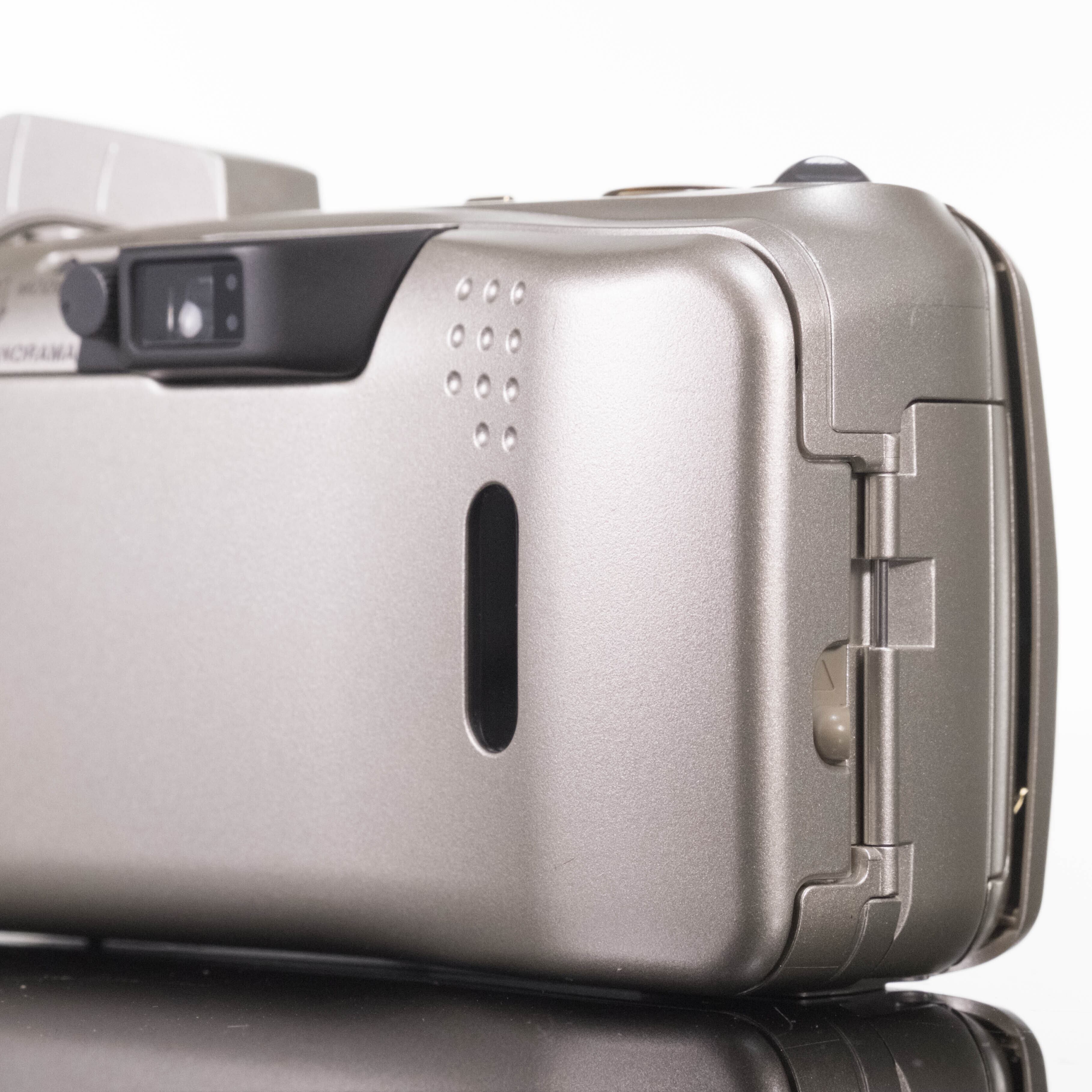 スイッチはレンズ前のカバーを横にスライドするとオンになり、同時にフラッシュが耳のように出てきます。