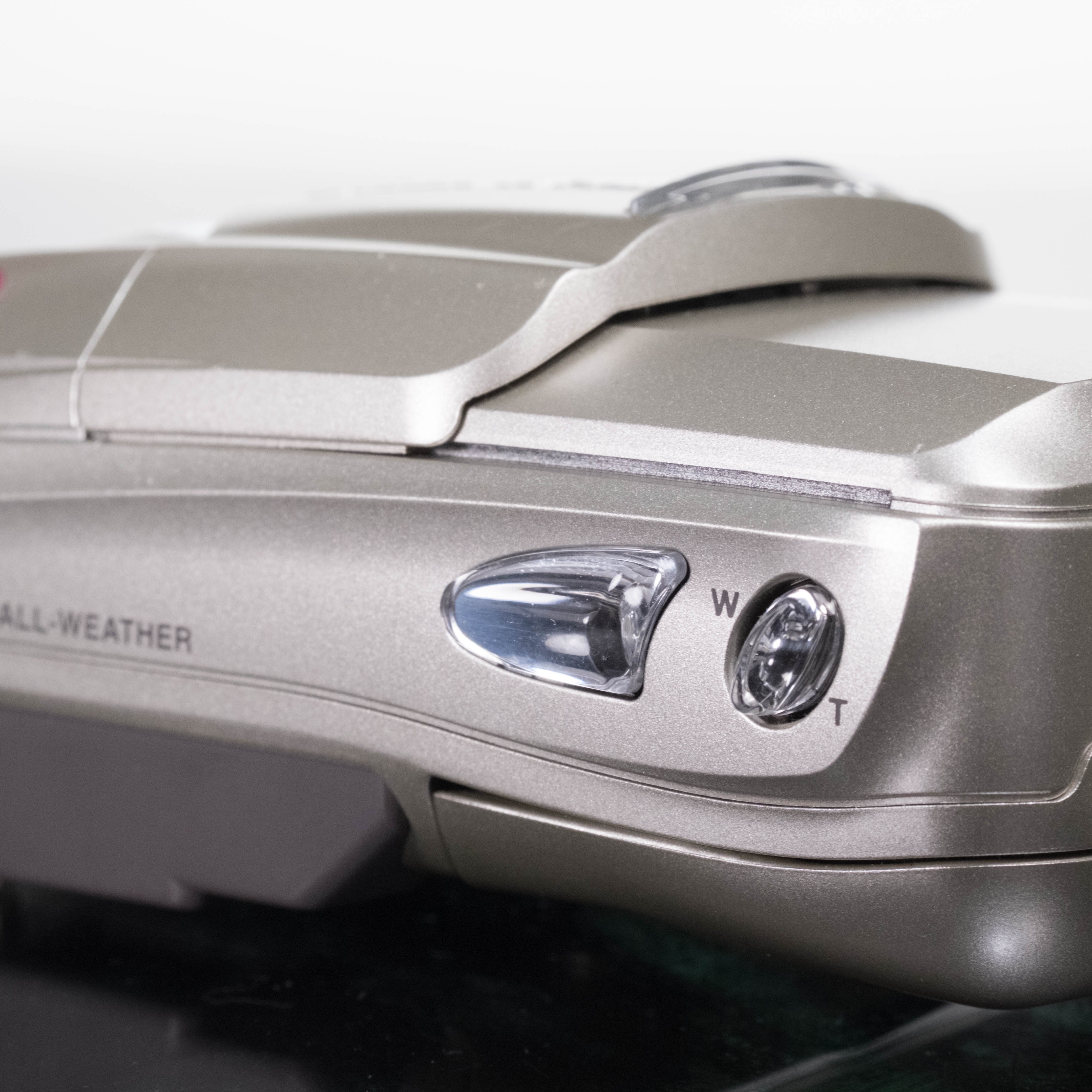 スイッチはレンズ前のカバーを横にスライドするとオンになり、同時にフラッシュが耳のように出てきます。
